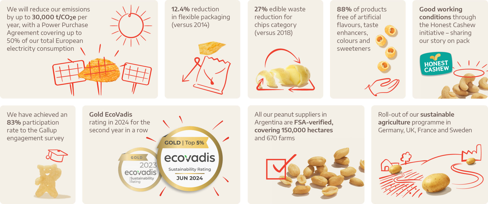В Intersnack вярваме, че малките стъпки могат да доведат до големи промени. В нашия последен доклад описваме действията, които предприехме през 2024 г., за да стимулираме устойчивата промяна в нашите операции и веригата за доставки, като подкрепяме усилията за намаляване на емисиите и опазване на планетата – днес и за бъдещите поколения.